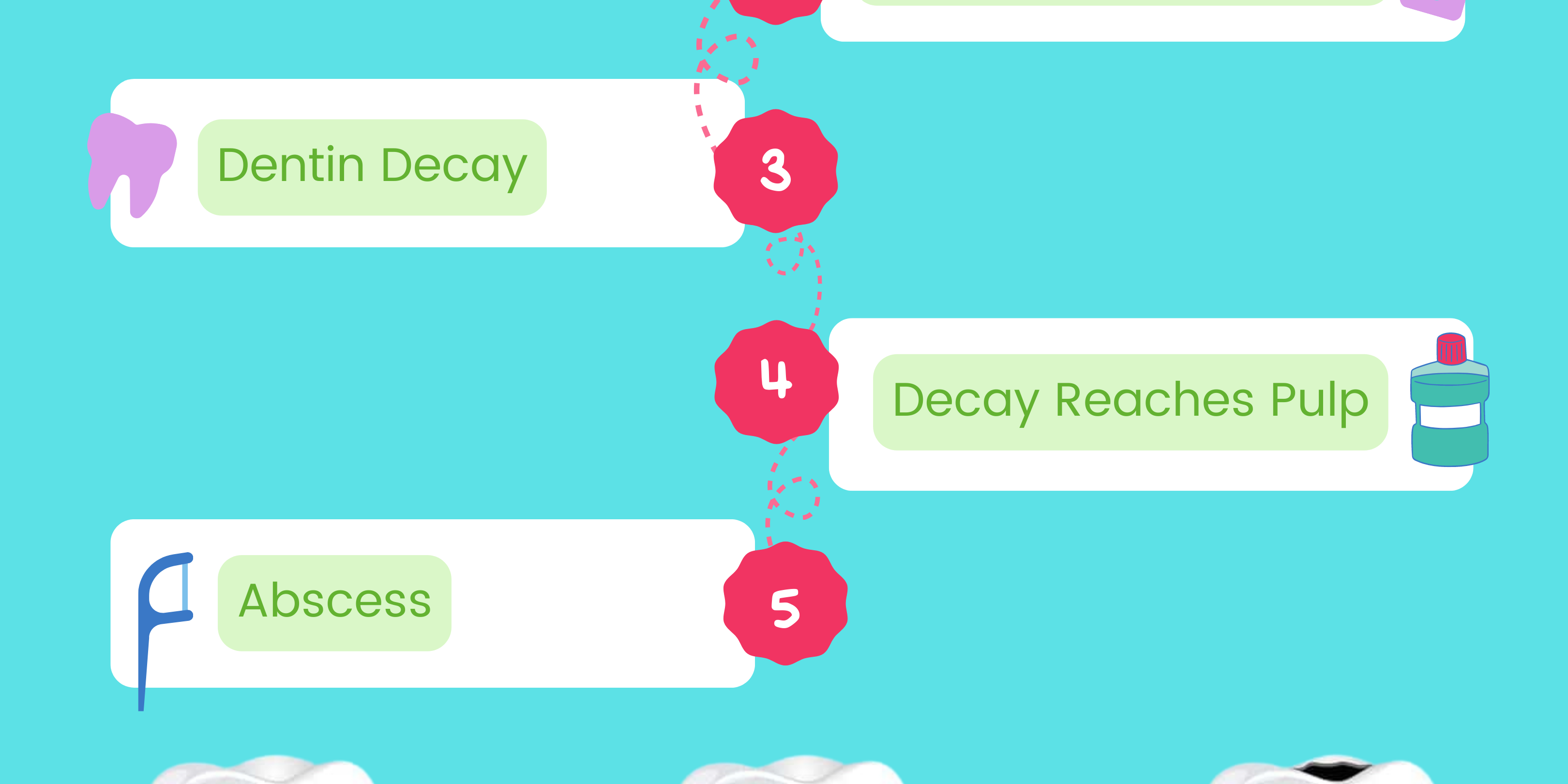Tooth decay occurs on the hard, outer layer of the tooth. There are five stages of tooth decay and the levels vary depending on severity. 1. Stage One: White Chalky Spots When initial demineralization occurs you might see white spots appearing on your teeth This visual that occurs is showing the areas of mineral loss and beginning of tooth decay. This happens when the mix of plaque and loss of calcium occurs. Naturally, your body will defend itself against these acids through the remineralization process. Saliva and fluoride in your water helps restore the minerals in your teeth that acids break down. 2. Stage Two: Dental Enamel Decay Tooth decay begins from the underside outward, in this stage you may notice the white chalky spots darkening to a brown color. This occurs because of the continual attacks on the tooth with harsh acids and a lesion within the tooth forms. Before the lesions turn into a cavity, it is important to visit your dentist to have the lesion treated. The dentist will protect your tooth with fluoride treatments or a dental sealant before it progresses into a cavity. 3. Stage Three: Dentin Decay As acid continues to decay the tooth further, the layer of tooth located below the enamel is affected. This layer is known as the “dentin” layer, it is hidden below the outer layer of the tooth but covers the pulp. Pain and hypersensitivity will occur at this stage because many microscopic tubules give access to the inner nerve of the tooth. The loss of minerals causes the tooth to collapse and can only be restored through treatment such as a filling at the dental office. 4. Stage Four: Decay Reaches the Pulp When the decay reaches the center of the tooth, there is a substance known as pulp. It is where all of the nerves and blood vessels of the tooth are located. As tooth decay occurs at this level the pain is more significant. The natural tooth is only able to be restored through a root canal procedure. 5. Stage Five: Abscess In the final stage, infection beyond the tooth occurs causing rooting of the teeth and damage in the jawbone and surrounding tissues. At this stage surgery is required and immediate medical attention is needed. If you are experiencing tooth decay, it is important to schedule your dental visit immediately. Call or text our office today to schedule your appointment!